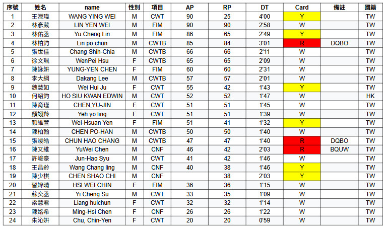 率先出場的王瀅瑋企圖以CWT 90米開局,可惜未能完成。接著輪到林彥葳,宣告FIM 90米,順利拿下白牌。連兩日出賽90米以上的深度,都順利完成,林彥葳拿下CWT 91米與FIM 90米獲兩項男子冠軍,同時穩定的表現也讓人印象深刻。